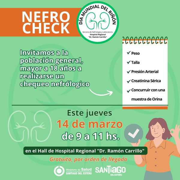 Este jueves, en el hall del Hospital Regional, el Servicio de Nefrología y Laboratorio ofrecerá controles gratuitos por orden de llegada, a toda la comunidad mayor de 18 años, de 9 a 11 horas. Se realizarán controles de peso, talla, presión arterial, laboratorio de sangre y de orina (se recomienda concurrir con una muestra de orina).