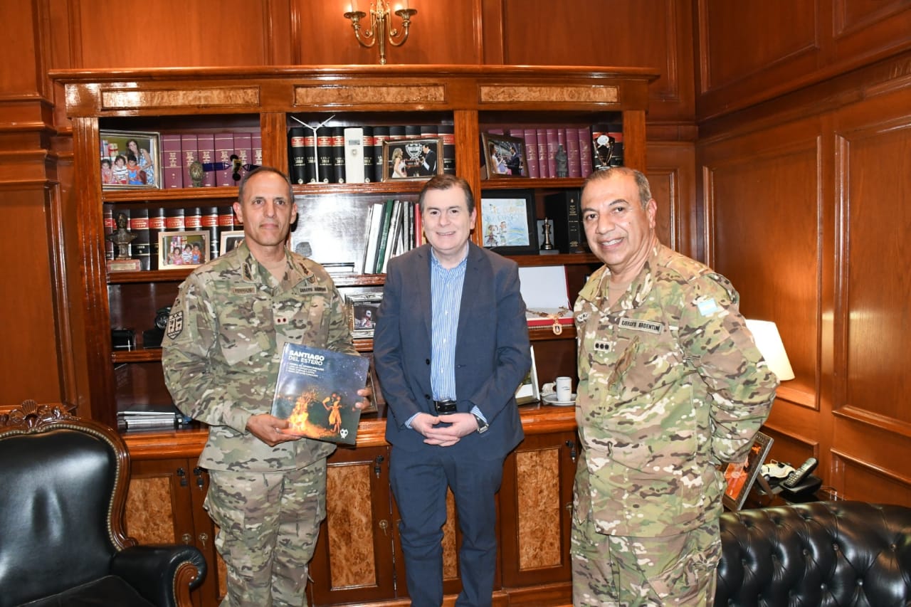 El gobernador Gerardo Zamora recibió este martes por la tarde en Casa de Gobierno la visita protocolar del general de brigada Aldo Daniel Ferrari, comandante de la Primera División del Ejército en Curuzú Cuatiá, Corrientes, quien estuvo acompañado por el jefe de la Delegación del Estado Mayor General del Ejército en Santiago del Estero, coronel Tomás Vázquez. Durante el encuentro intercambiaron obsequios y ratificaron el compromiso de continuar trabajando conjuntamente entre la fuerza y la provincia al servicio de la comunidad