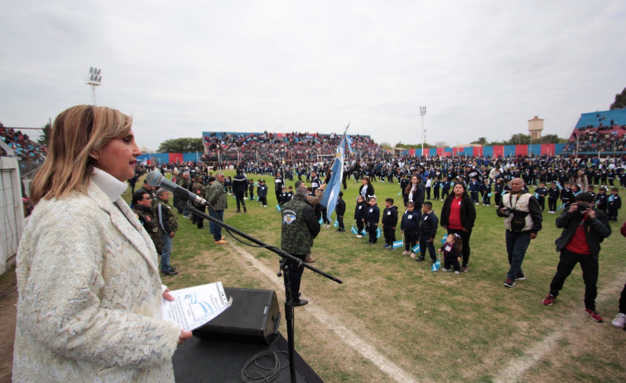 En el estadio de Club Güemes colmado por padres, familiares y equipos de trabajo de cada uno de los establecimientos educativos, la jefa comunal tomó la promesa a los niños en medio de un clima ampliamente participativo y que tuvo en su presentación el espectáculo del cuerpo de paracaidistas del Ejército Argentino que descendió al campo de juego portando la enseña nacional.
