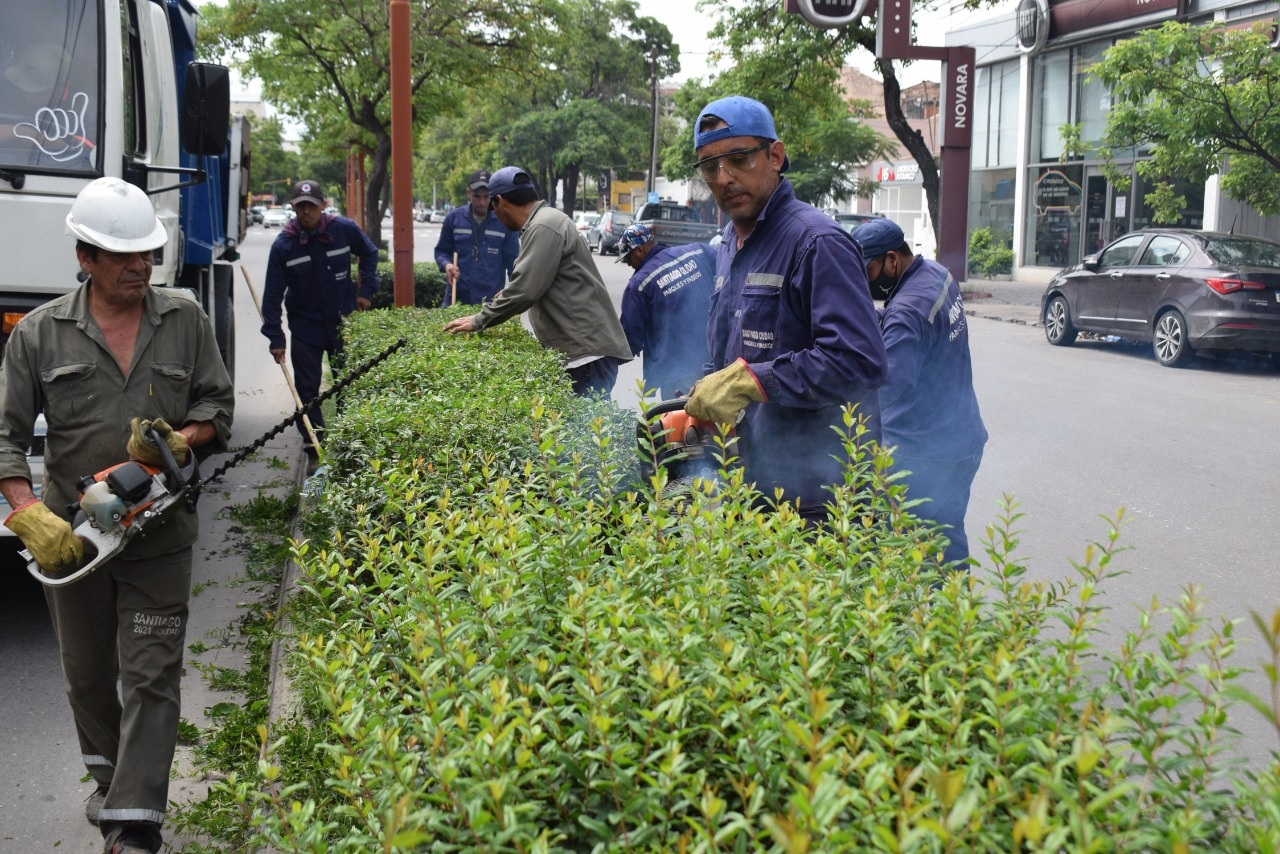 Personal de la Dirección de Parques y Paseos, lleva adelante la labor con la asistencia de máquina corta cercos y con tijerones de poda, dando al cerco vivo, un aspecto cuidado y prolijo, además de mantener a las plantas más compactas, lo que evita en gran medida el cruce de peatones a lo largo de las calles.