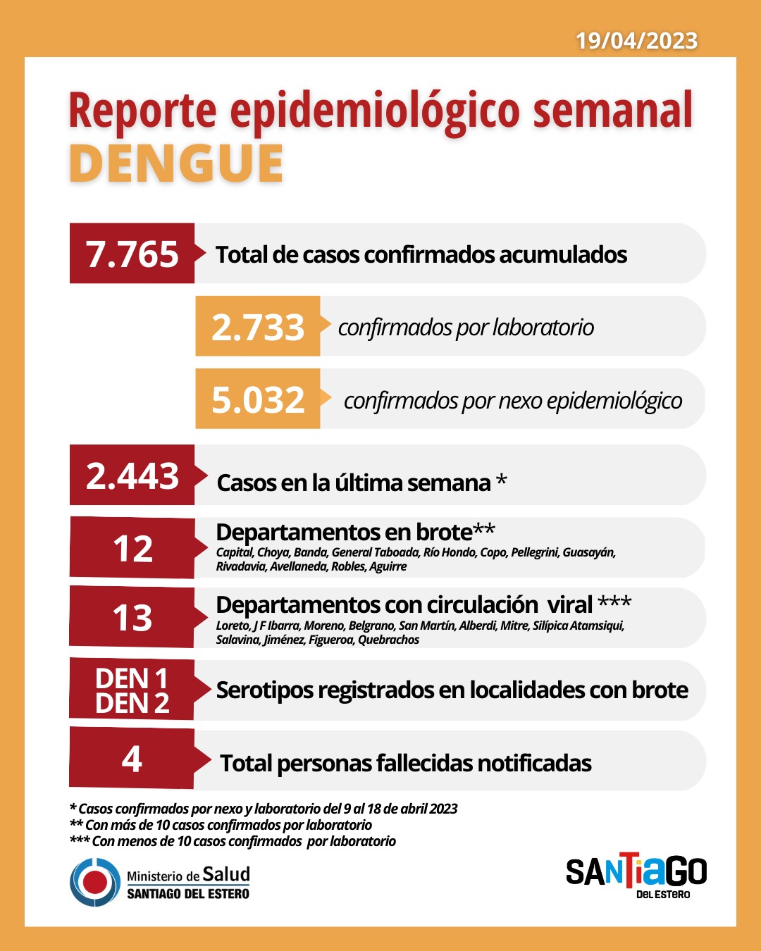 Departamentos con circulación viral**: 13 (Loreto, J F Ibarra, Moreno, Belgrano, San Martín, Alberdi, Mitre, Silípica Atamsiqui, Salavina, Jiménez, Figueroa, Quebrachos)