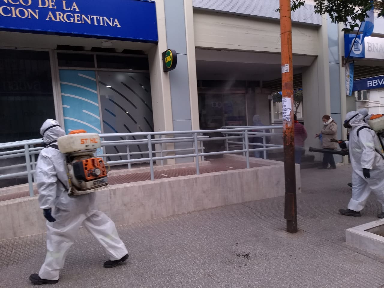 La Dirección de Calidad de Vida de la Capital llevó a cabo la sanitización de la zona bancaria y de cajeros automáticos para brindar mayor seguridad sanitaria por el movimiento de personas que se dará los días jueves y viernes por el pago de sueldos.