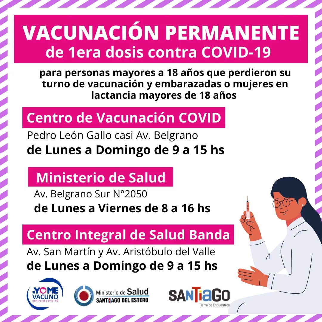Si sos mayor de 18 años y por alguna razón perdiste tu turno de vacunación contra COVID-19, acércate a alguno de los centros de vacunación permanente en Capital y La Banda. Si estás en el interior de la provincia, acércate al hospital más cercano.