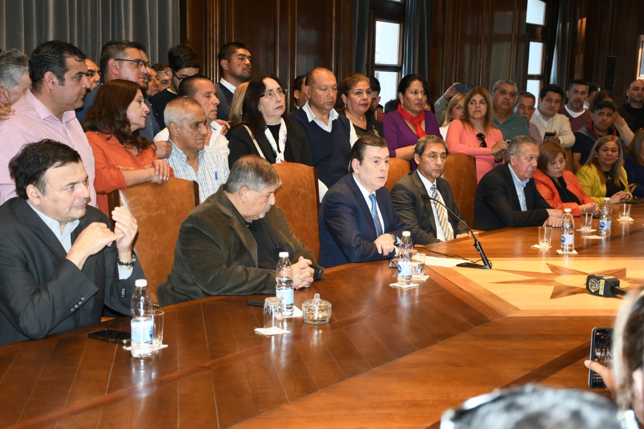 El mandatario santiagueño estuvo acompañado en esta oportunidad por el vicegobernador Carlos Silva Neder; el jefe de Gabinete de Ministros, Elías Suárez; el ministro de Economía, Atilio Chara; la secretaria de Trabajo, Julia Comán; el secretario general de la CGT, José Gómez; el secretario adjunto Gerardo Montenegro, y representantes de todas las organizaciones sindicales que forman parte de la Mesa de Diálogo del Trabajo.