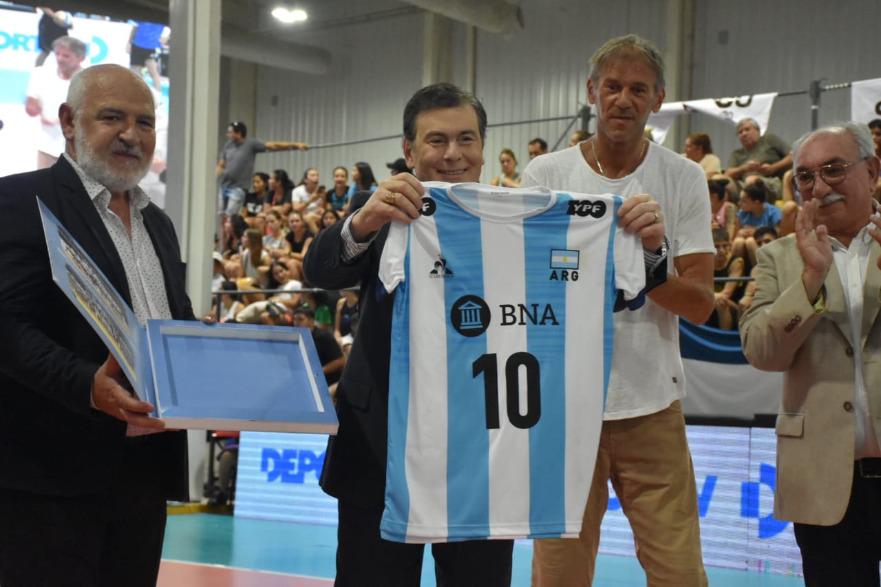 En el entretiempo de la final femenina entre Vélez y Sonder, Zamora hizo entrega de una plaqueta al capitán del Seleccionado Argentino de Vóley, Javier Filardi.