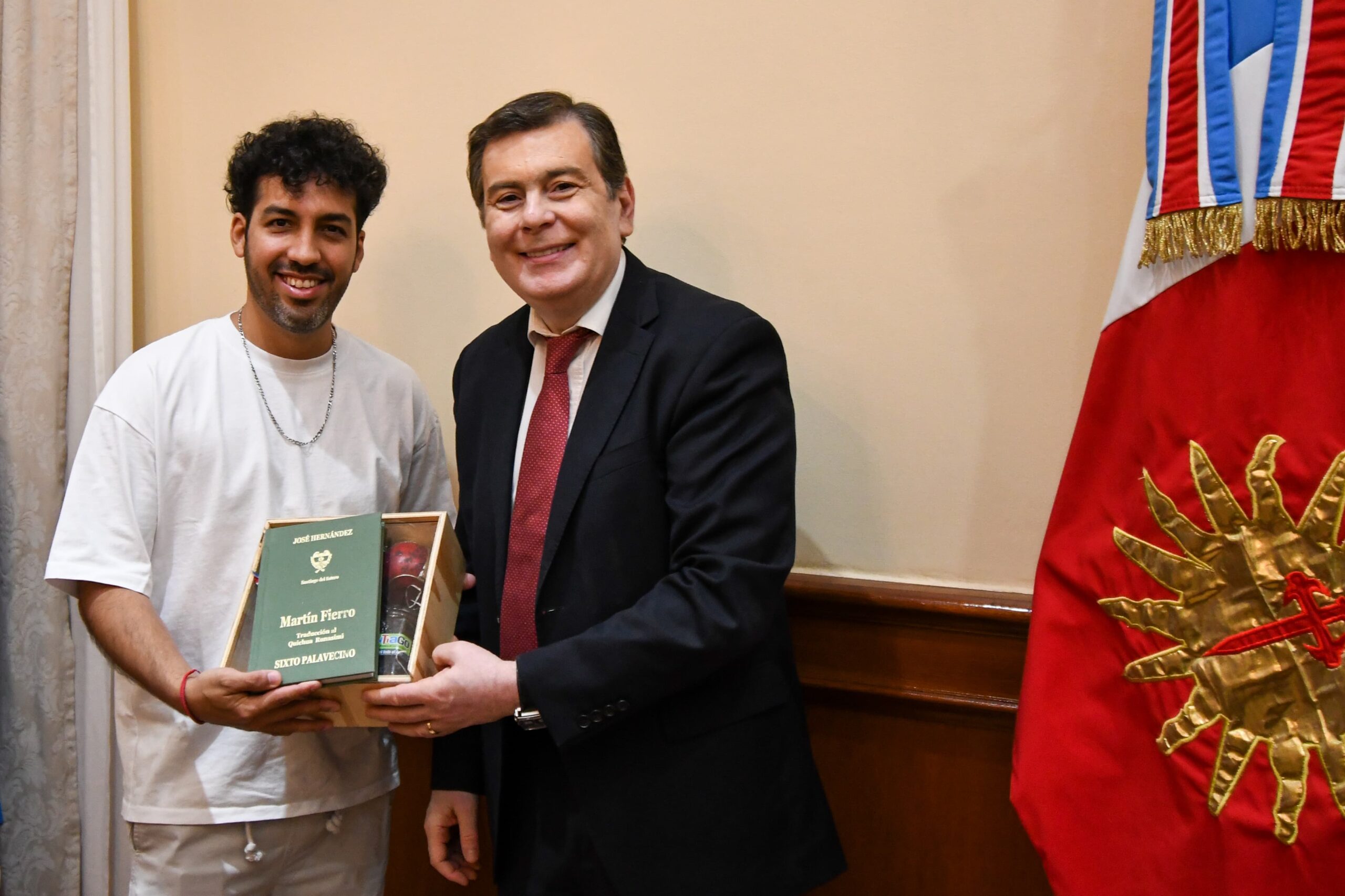 El gobernador Gerardo Zamora recibió este viernes por la mañana la visita del artista santiagueño Santiago Alvarado, ganador del premio Latín Grammy 2023 junto con el músico Bizarrap.